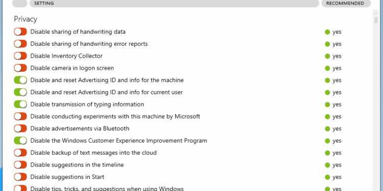 - Apply Recommended Settings: If you’re not sure what to do, you can go to Actions > Apply only recommended settings. This will turn off a lot of Windows tracking features and bloat safely. For instance, it will disable telemetry, typing and inking data collection, Cortana, feedback requests, and other Windows 11 privacy settings that are better turned off for most users.