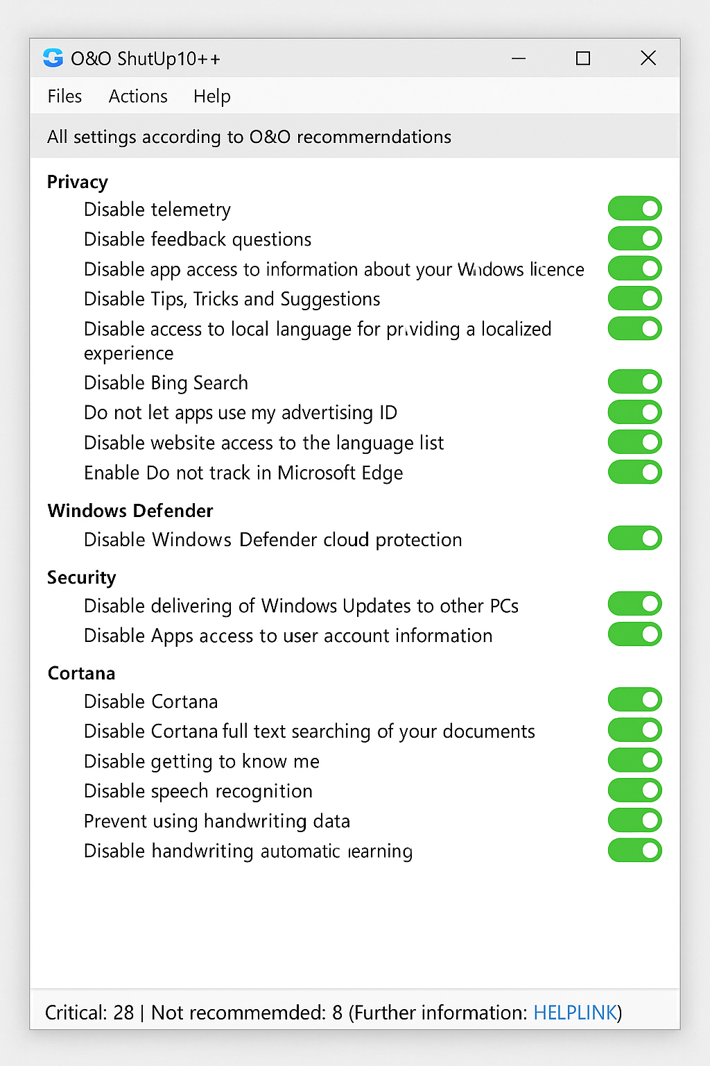 What O&O ShutUp10++ does: It lists a wide range of tweaks, from disabling telemetry and data collection, to turning off Cortana, OneDrive integration, and other background services. Each setting is labelled with a recommended status (green = safe to disable, yellow = use caution, red = know the trade-off). You can apply all recommended tweaks in one go, or pick and choose individually. For example, you can disable things like “Send Windows usage data for advertising”, “Enable Windows Defender cloud protection” (if you prefer not to send files to Microsoft), and many more under-the-hood options .