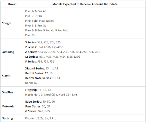 It is anticipated that the Android 16 upgrade would initially only be accessible on Pixel smartphones that are compatible. Other companies will either directly distribute the update or apply a custom operating system skin to it. Although the complete list of compatible devices is not yet public, certain smartphones are guaranteed to receive the update depending on the manufacturer’s specified number of update cycles. The following is the list: