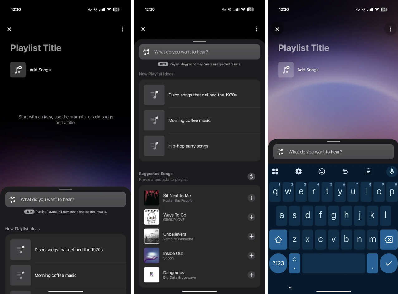 Users can make a playlist without AI using the upper part of this new UI. You can type a prompt on the bottom sheet, and Apple Music provides “Suggested Songs” and “New Playlist Ideas”.