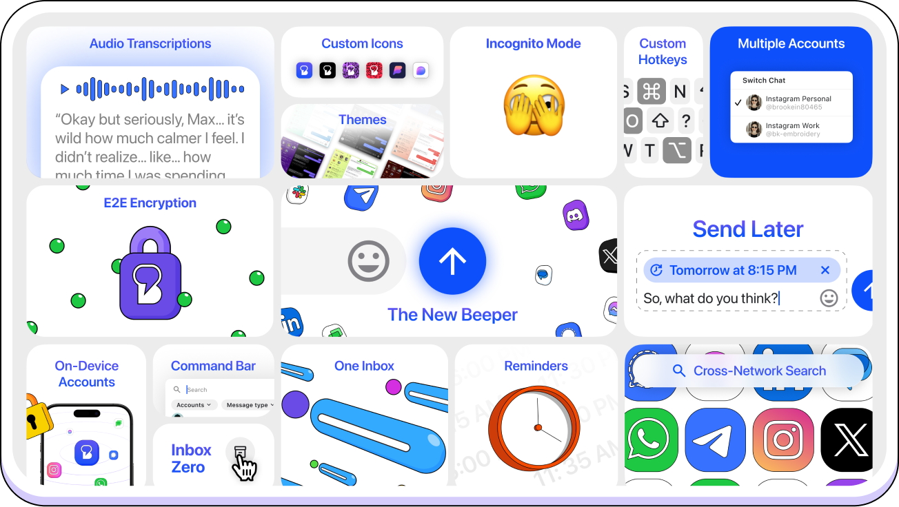 Although the basic features of the app are still free, users can now choose to upgrade to Beeper Plus, which adds new premium features. These consist of voice message transcription, message scheduling (send later), reminders, custom app icons, support for up to three accounts from the same network (up to ten accounts total), and an Incognito mode that lets users preview chats without sending a read receipt.