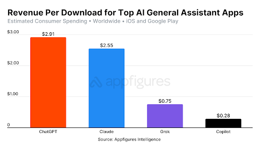 Claude’s $2.55, Grok’s $0.75, and Copilot’s $0.28 lifetime global spending per download, according to Appfigures, is higher than ChatGPT’s $2.91.