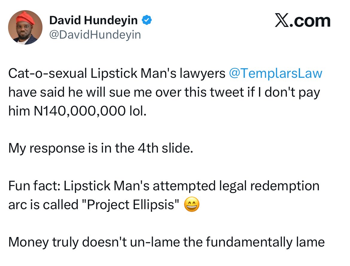 In a public denial of the notice on X, David Hundeyin ridiculed the lawsuit and mockingly asked Olubi’s attorneys to raise the demand to ₦140 billion.