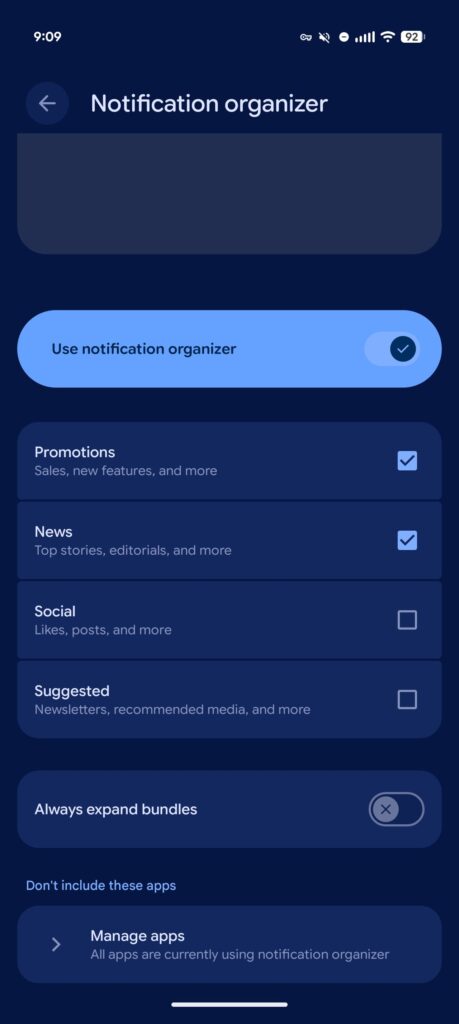The following categories Promotions, News, Social, and Suggested are part of which the Notification Organiser will group users alerts into. The remaining ones need to be enabled based on your interests, but the first two are already on and another option is to “Always expand bundles.”
