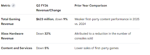 Microsoft’s overall revenue rose 17% in its Q2 FY26, fuelled by cloud growth. However, its gaming division saw a broad decline, with total gaming revenue down 9% and Xbox content and services revenue falling 5% for the quarter ended December 31.