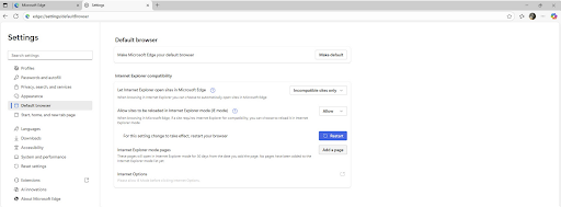 Microsoft Edge features an IE mode for legacy compatibility with older technologies (ActiveX and Flash) that are still in use with a limited number of corporate apps and government portals, even though support for Internet Explorer terminated on June 15, 2022.