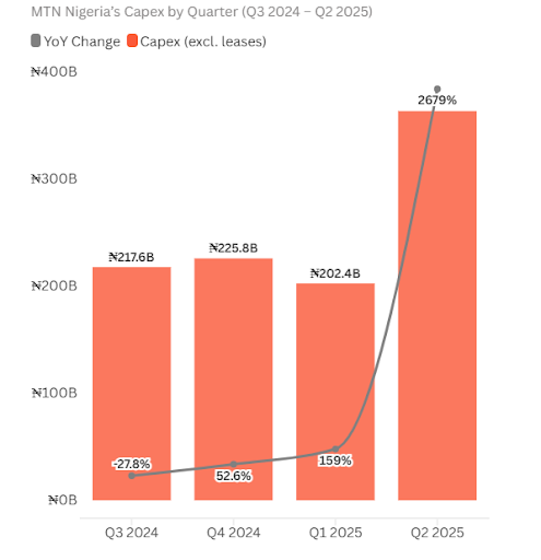 MTN’s capital expenditures (excluding leases) increased 288.4% year over year to ₦565.7 billion ($377.13 million at ₦1500) in the first half of 2025 as the company expanded its fibre rollout, built out passive infrastructure, and expedited the deployment of 4G sites.