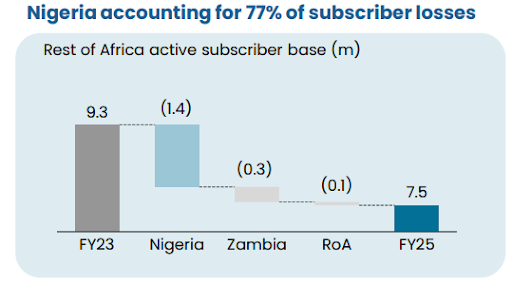 Additionally, it disclosed that between 2023 and 2025, Nigeria was responsible for 77% of the subscriber loss observed throughout its Rest of Africa (RoA) activities.