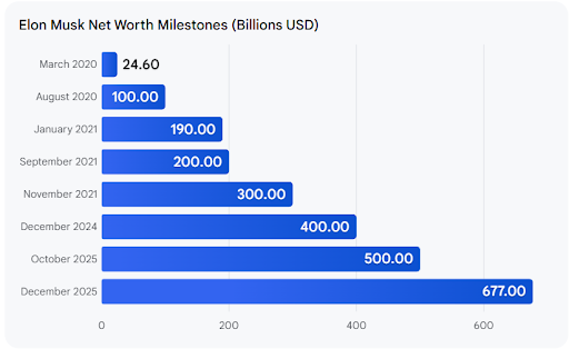 Musk’s net worth surpassed that of Larry Ellison of Oracle, the only other individual to surpass $400 billion, when it reached $400 billion in December 2024 and $500 billion in October. Larry Paige, a cofounder of Google with a net worth of approximately $252 billion, currently supports Musk.