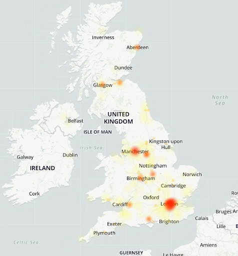 Other cities, such as Manchester, Edinburgh, and Birmingham, have seen a considerable number of reports filed.