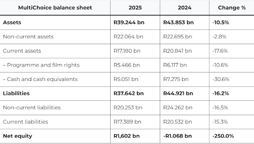 MultiChoice reported a 10.5% decline in assets, primarily due to a 17.6% loss in current assets, despite improvements in liabilities.