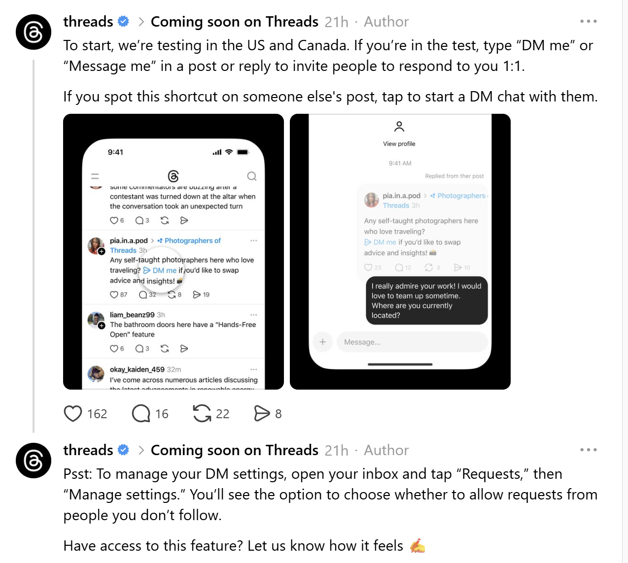 A limited number of users in the United States and Canada will be able to access the new service. It’s unclear when or whether Threads intends to make the feature more generally available, much like with any other test feature.