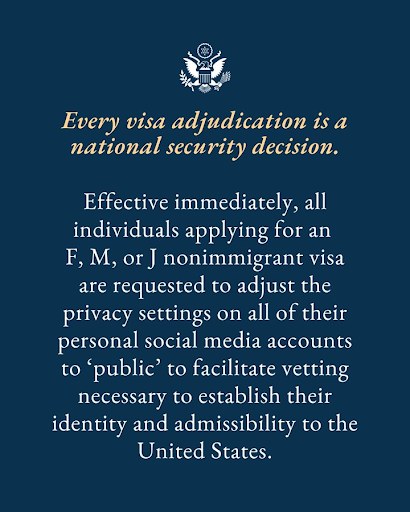 “All applicants for F, M, and J non-immigrant visas will be directed to change the privacy settings on all of their social media profiles to ‘public’ in order to expedite this vetting.”
