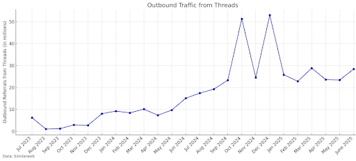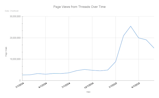 It’s interesting to see that referrals from Threads peaked in March, according to data from Chartbeat and Similarweb for 2025. According to Similarweb, Threads generated 28.8 million outbound website referrals during that month, and Chartbeat publishers reported 25 million page views.