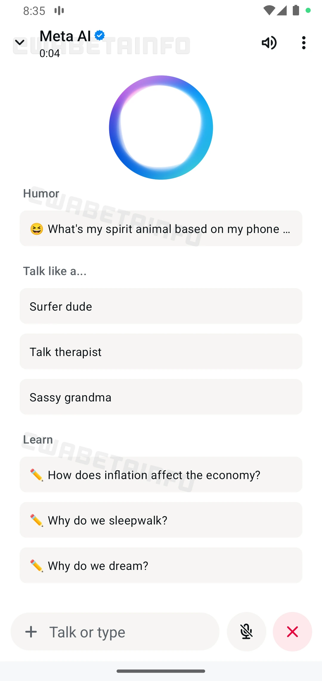 It is anticipated that the upgrade would have two-way audio communication with Meta AI, another rumored feature. When a user chooses a topic, the new Meta AI user interface opens with a two-way voice chat interface (also rumored earlier), which can be helpful, particularly for the “Talk like a…” genre while educational talks may be facilitated in the “Learn” area. and function as a quick preset for the function. This would add an interactive element to the experience by enabling users to start a voice chat with the AI after choosing a topic. Additionally, users will always have the choice to return to text chat. The feature tracker also stated that users are able to have a conversation in text with the AI on these available topics by terminating the voice chat.